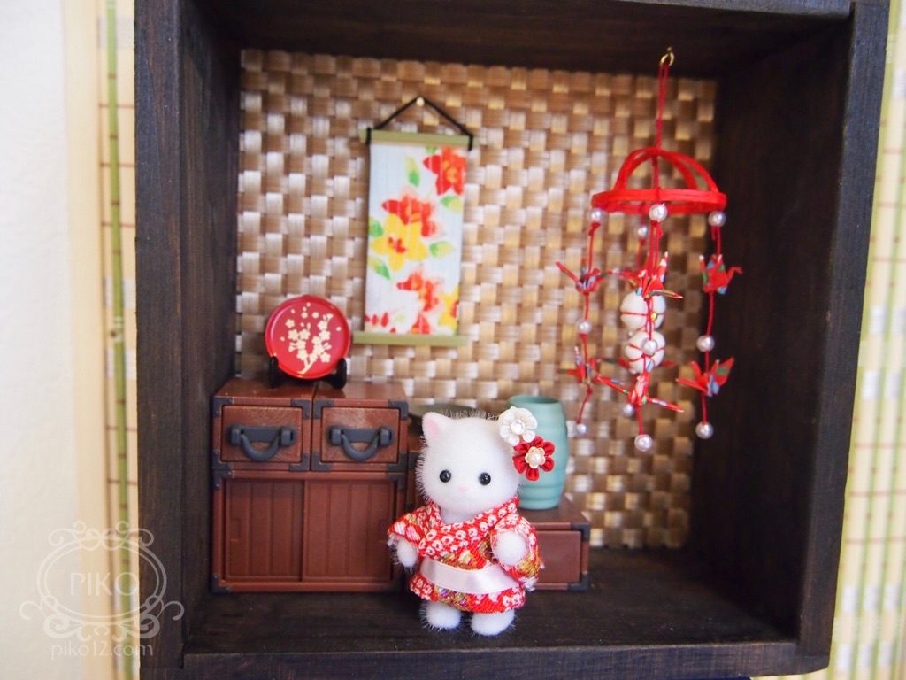 こんな感じ。新しく作ったのは掛け軸もどきと吊し飾りだけですが、一緒に置いた和だんすのクオリティに支えられ、いい感じに収まりました。