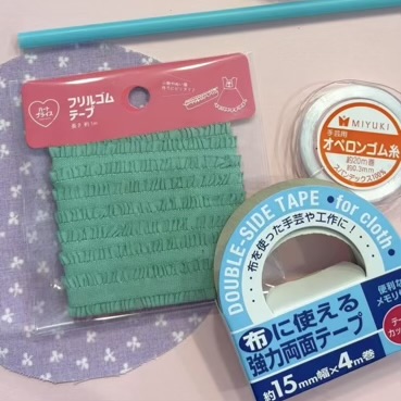 両面テープは100均など、割とどこにでもあるけれど、ゴム糸は手芸屋さんなどでしかお取り扱いないかもしれません。